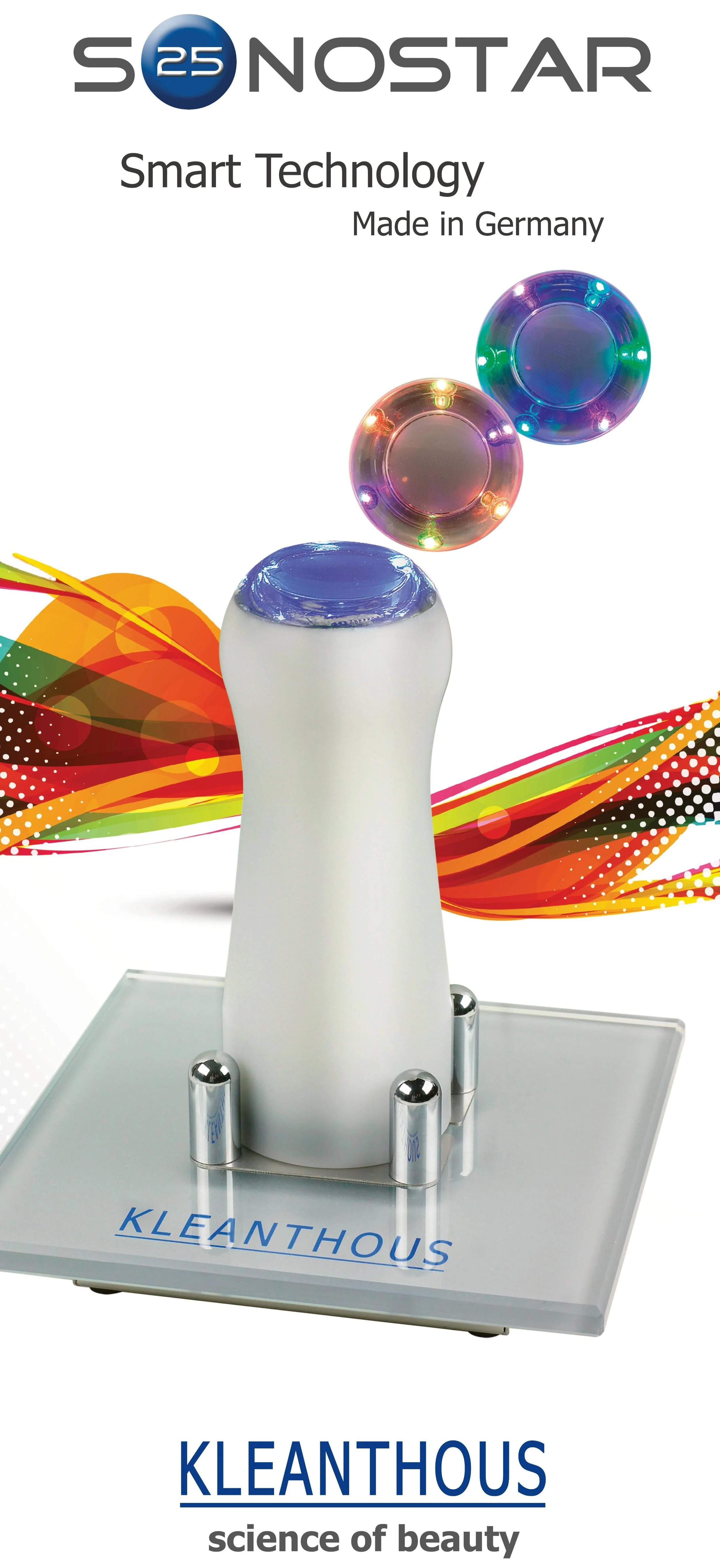 Inspiriert durch wissenschaftliche Erkenntnisse hat KLEANTHOUS eine Weltneuheit entwickelt, die einen technologischen Durchbruch darstellt. Das erste Ultraschallgerät für die Kosmetik mit medizinischem Glaskopf und einer leistungsstarken, hochintegrativen LED-Technik, die spezielle, auf die kosmetische Anwendung abgestimmte Spektralfarben erzeugt. Weiterhin komplettieren modular programmierte Ultraschallfrequenzen die außergewöhnliche Wirkungsweise des neuen, einzigartigen Gerätes. Vielfältige kosmetische Anwendungsmöglichkeiten lassen sich nun verwirklichen, die vorher so nicht machbar waren.